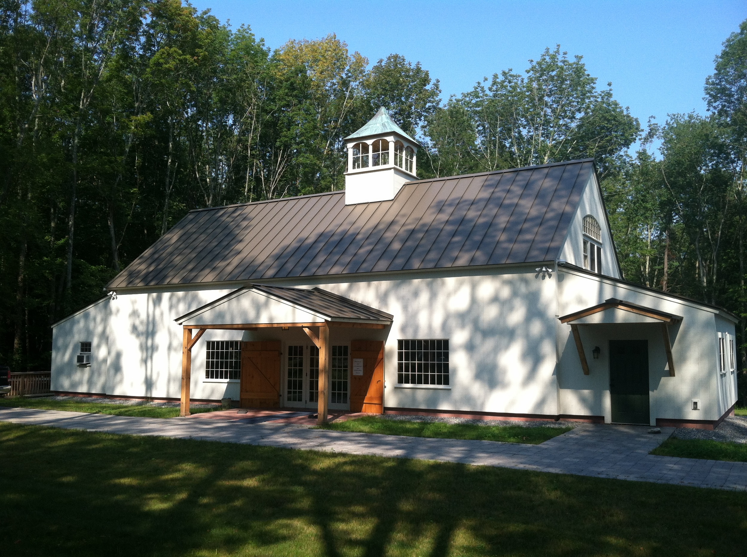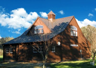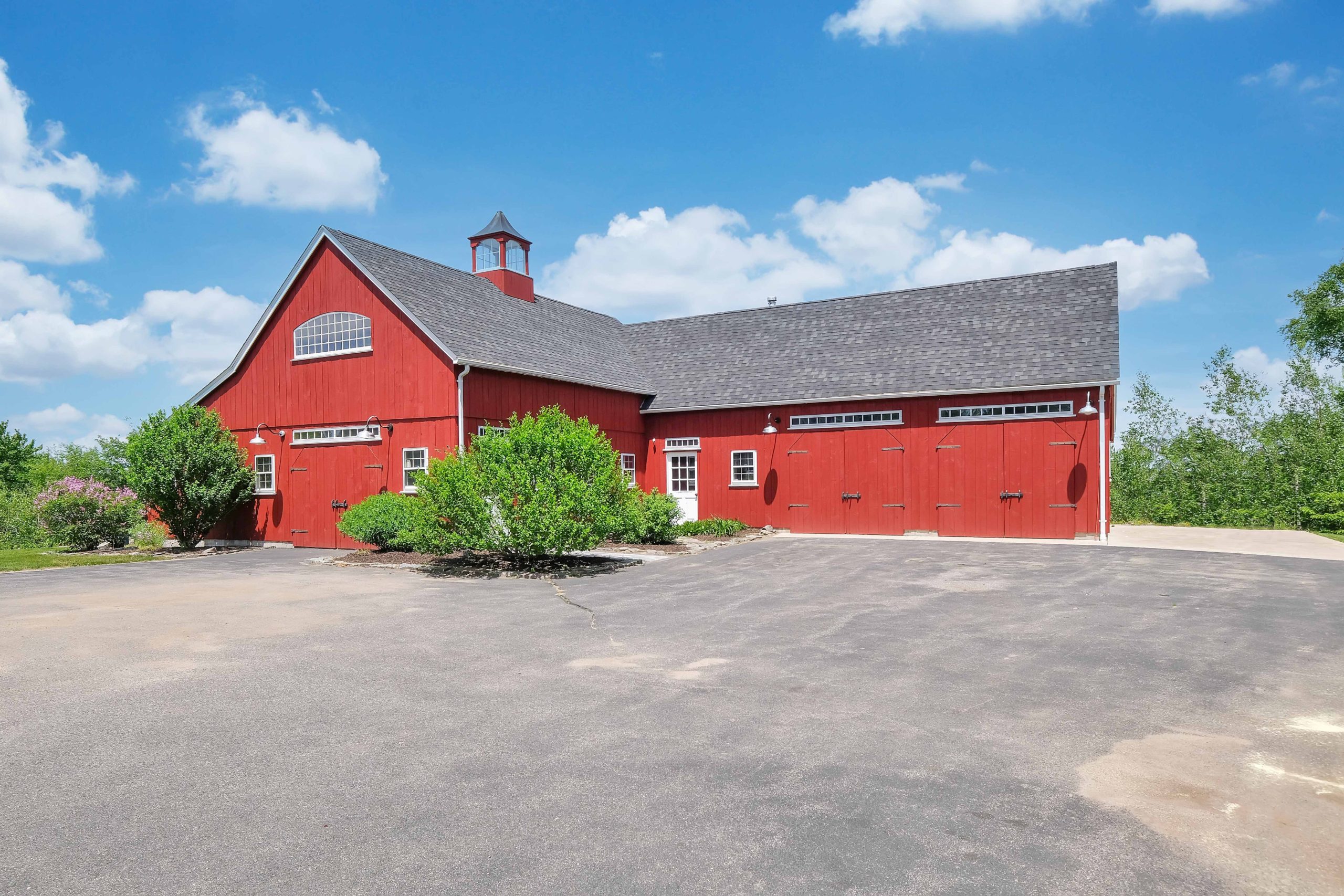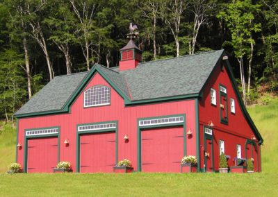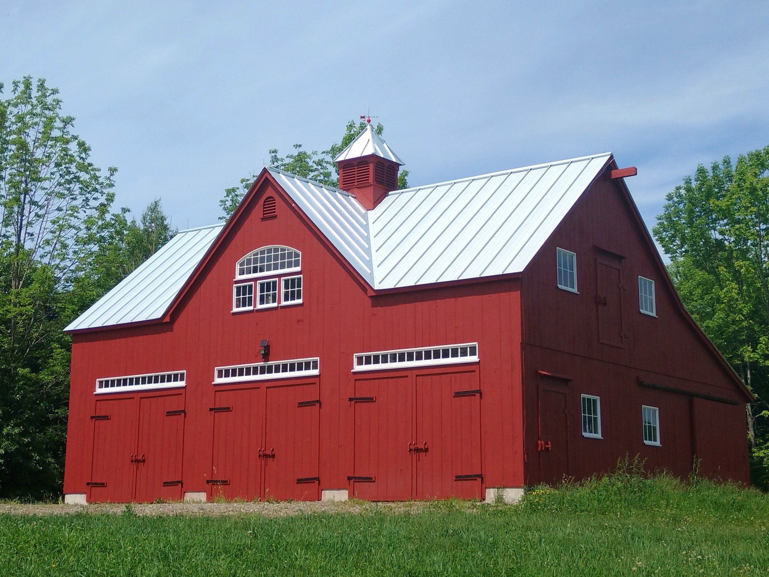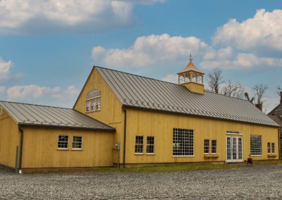 22′ x 36′ Lincoln shown with windowed cupola, 9′ x 7′ and 9’ x 8’ swinging doors, 8′ slider, walk-out door and windows including our signature bow-top