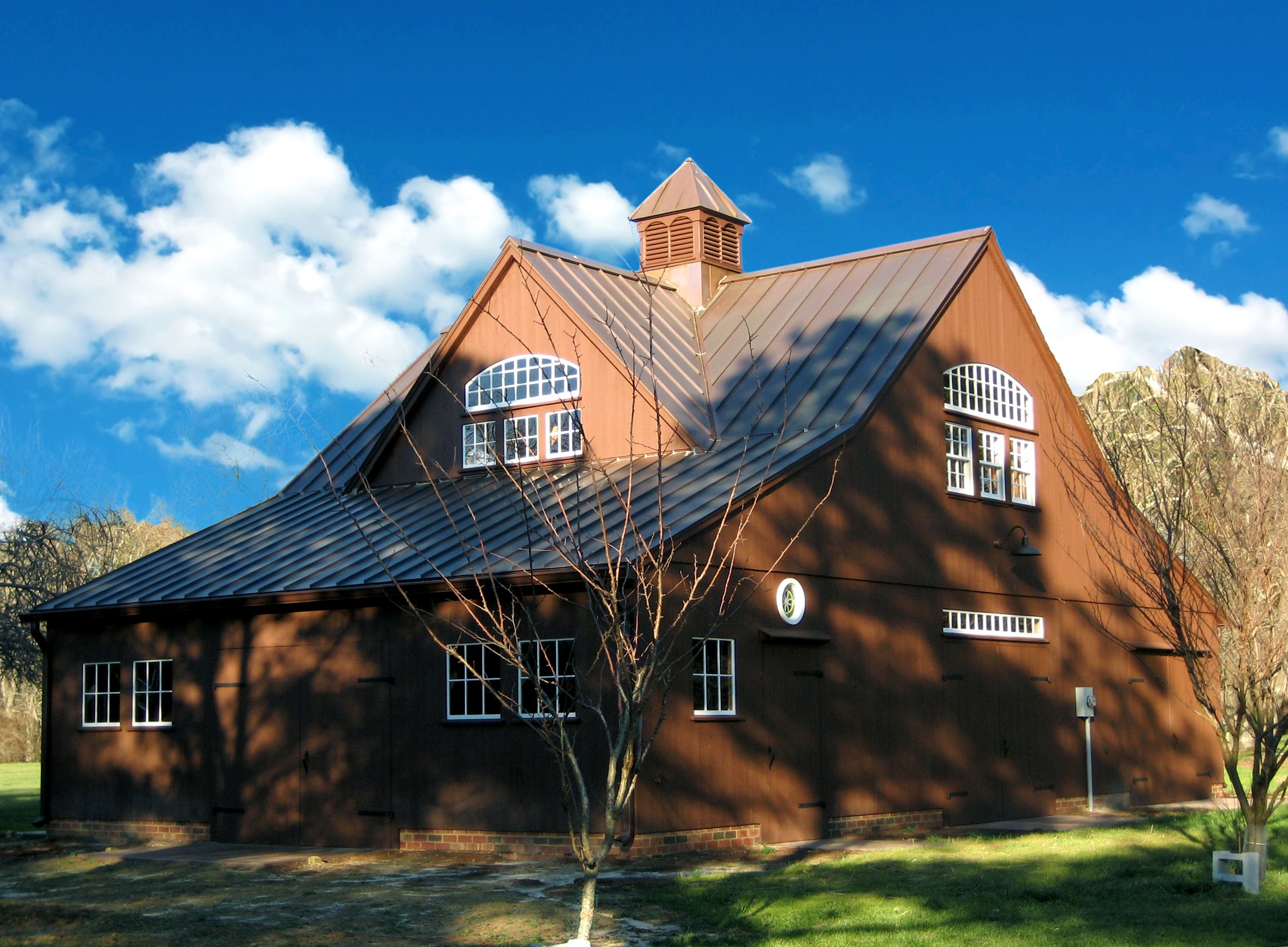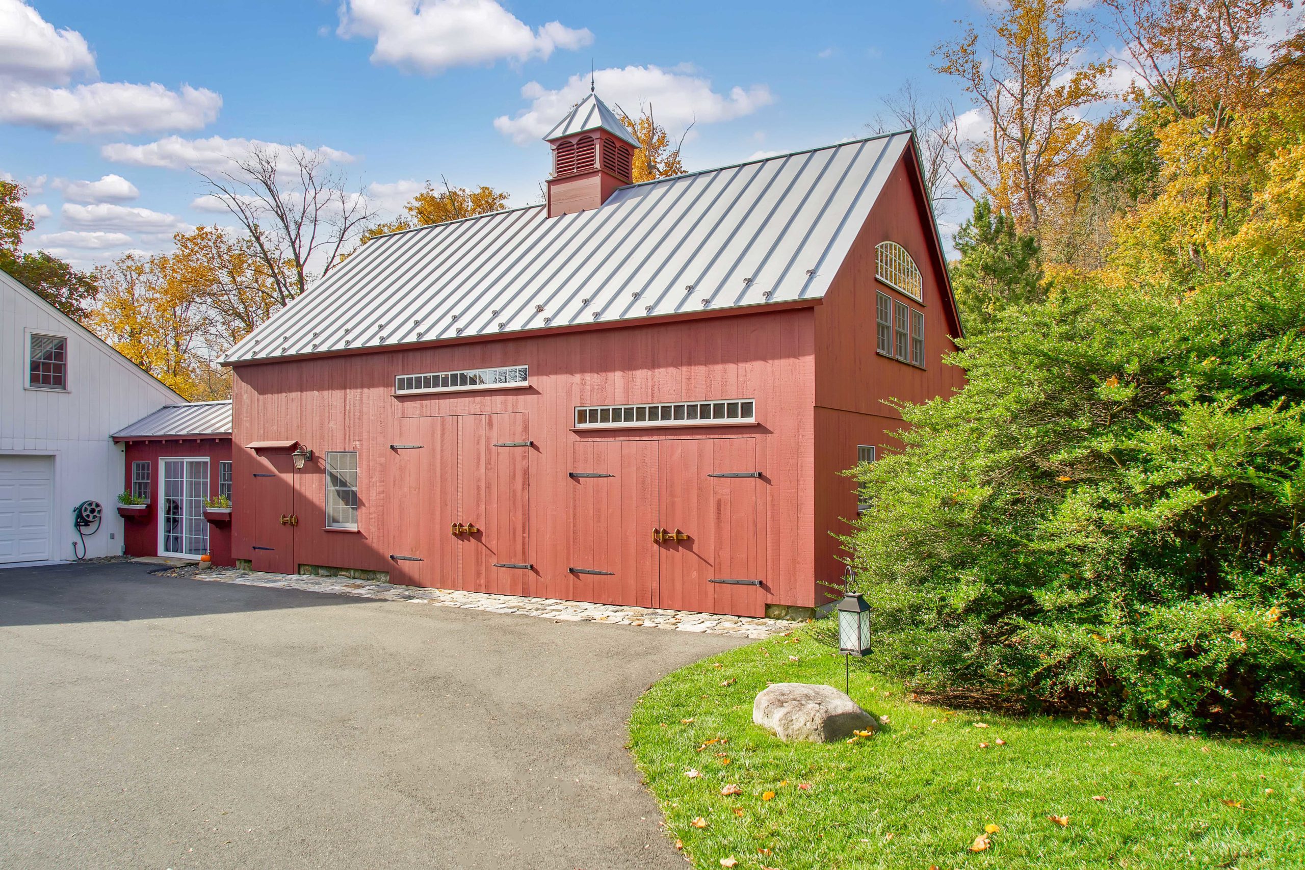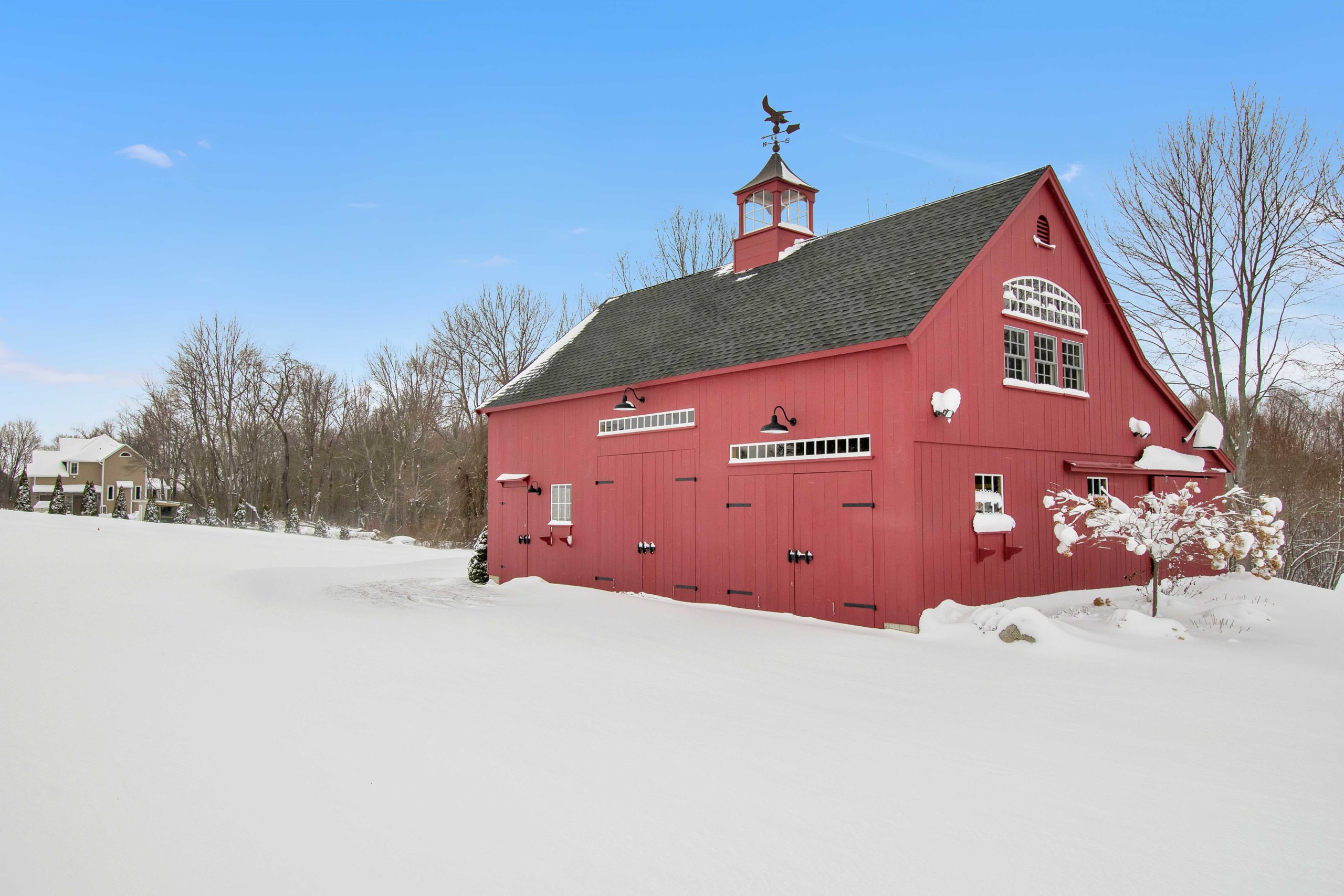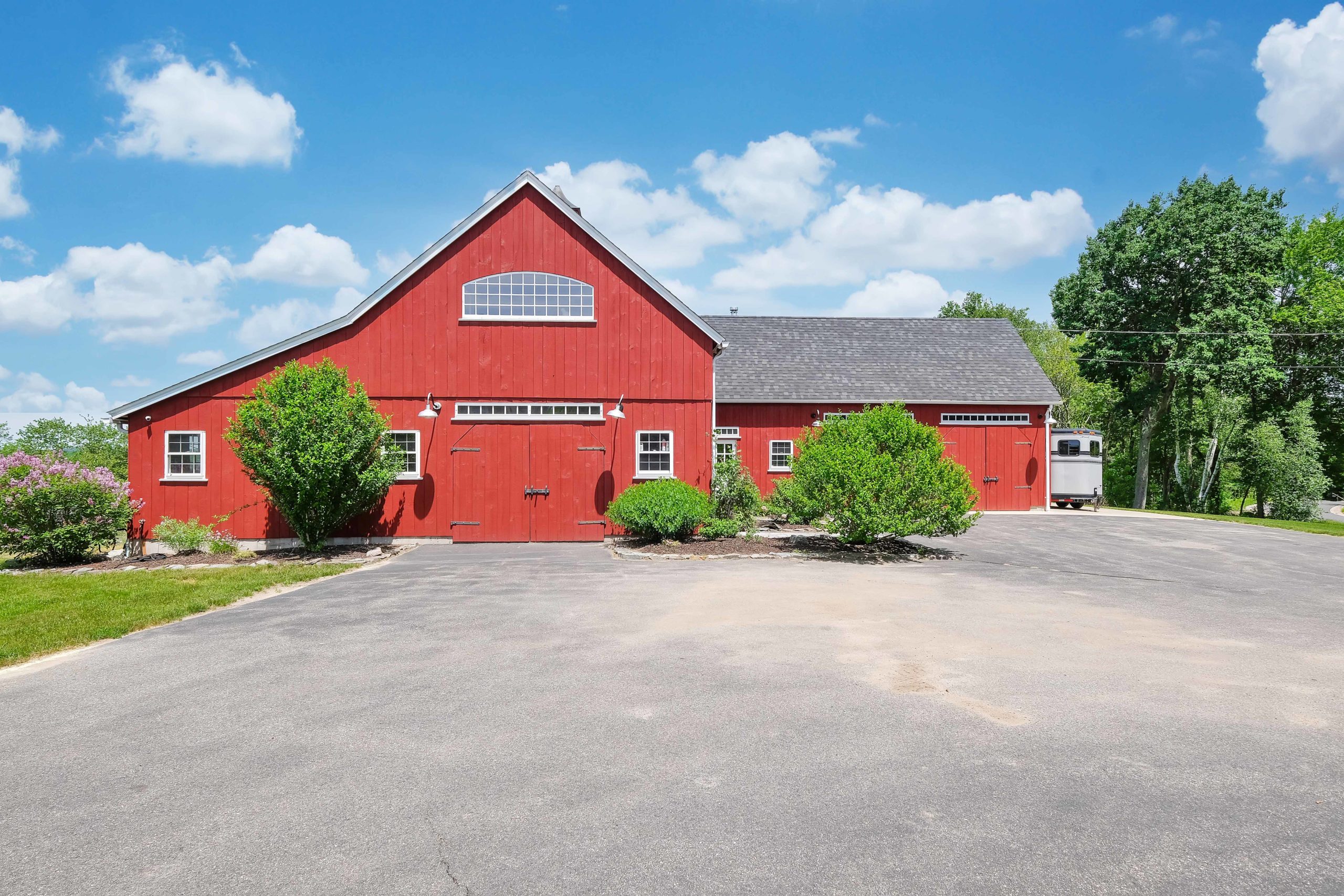 22′ x 36′ Lincoln shown with windowed cupola, 9′ x 7′ and 9’ x 8’ swinging doors, 8′ slider, walk-out door and windows including our signature bow-top