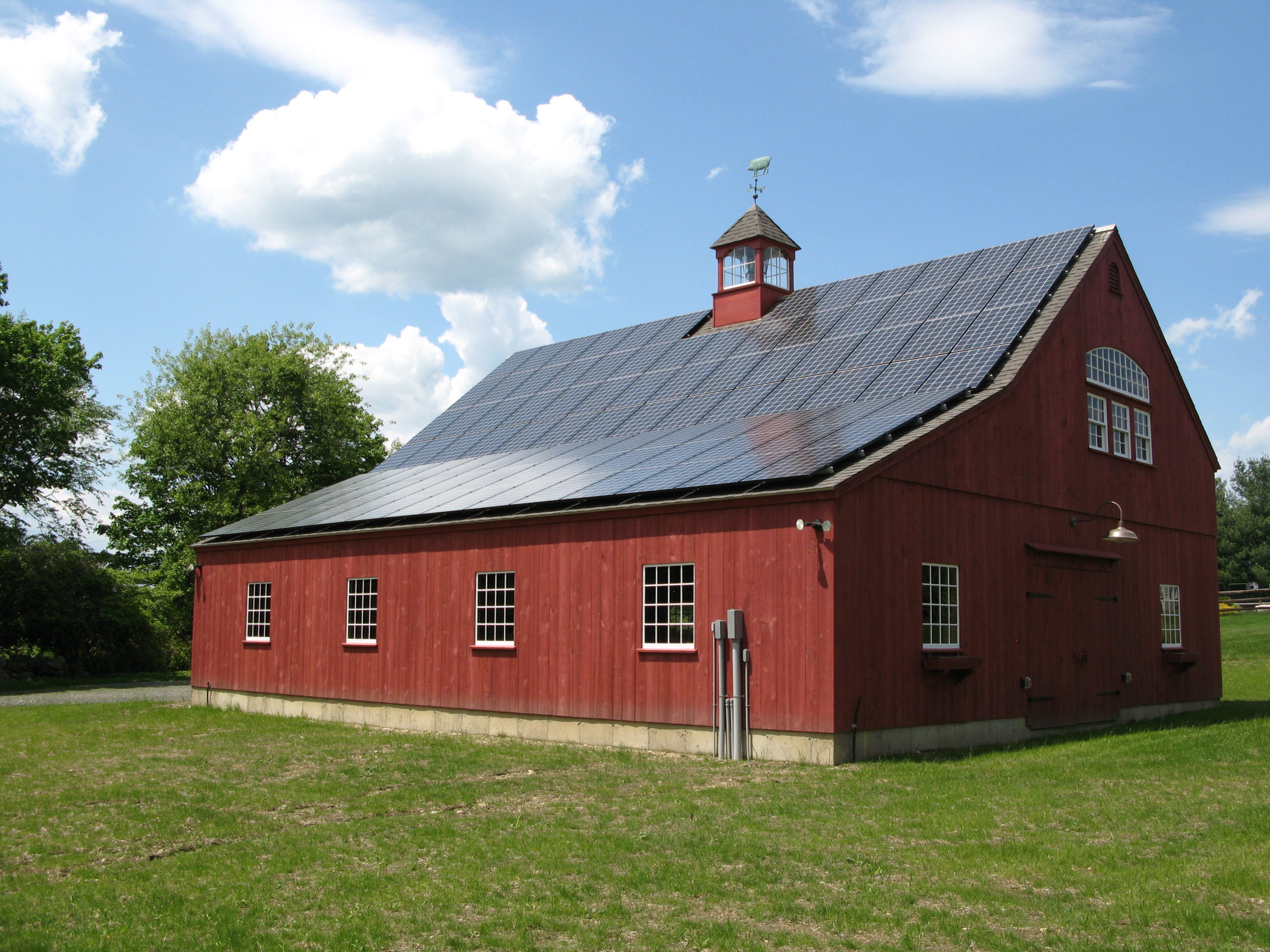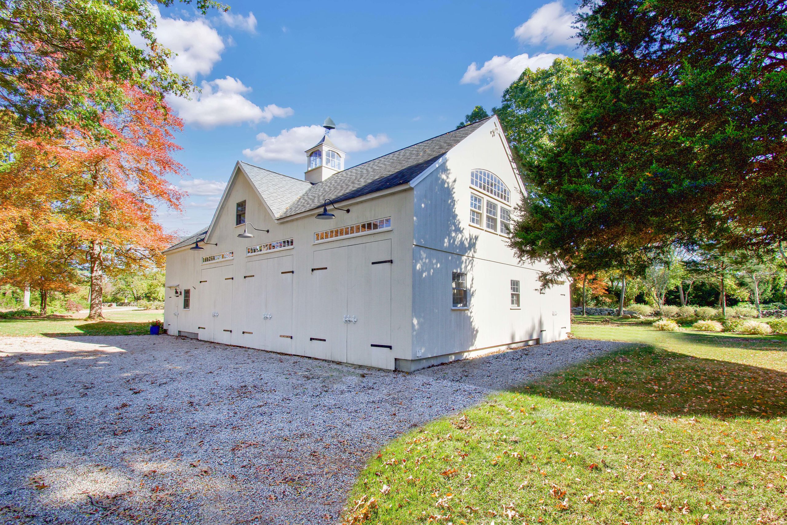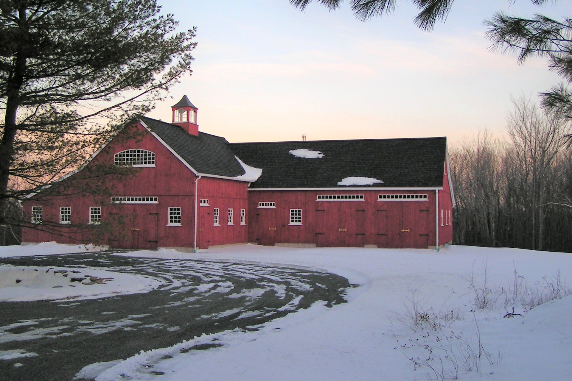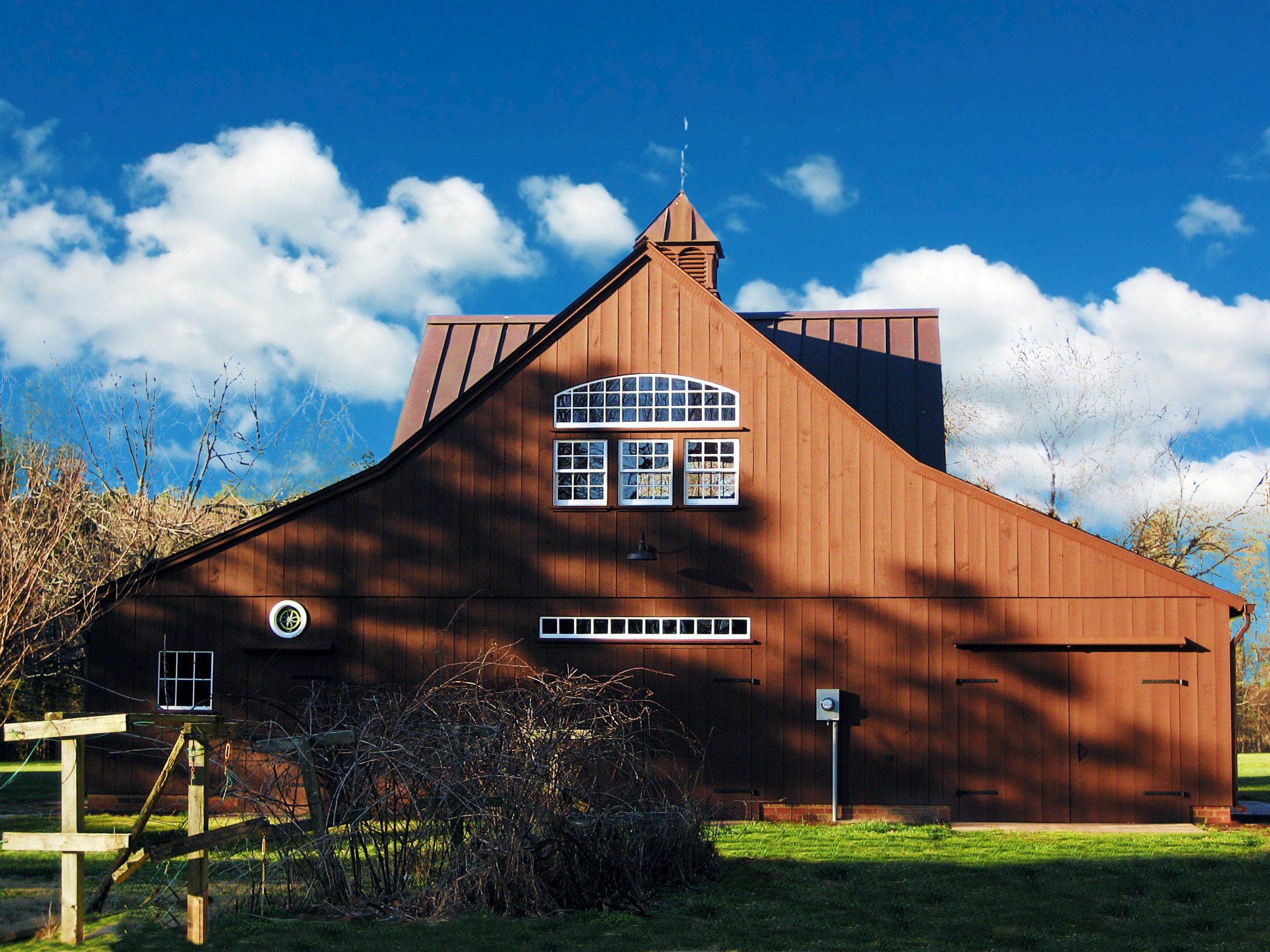 22′ x 36′ Lincoln shown with windowed cupola, 9′ x 7′ and 9’ x 8’ swinging doors, 8′ slider, walk-out door and windows including our signature bow-top