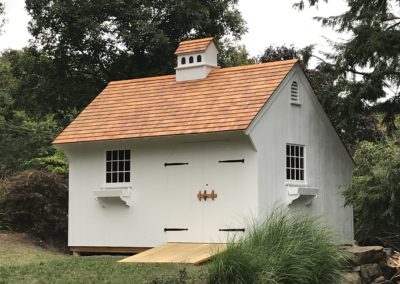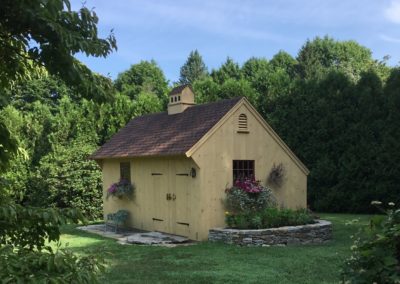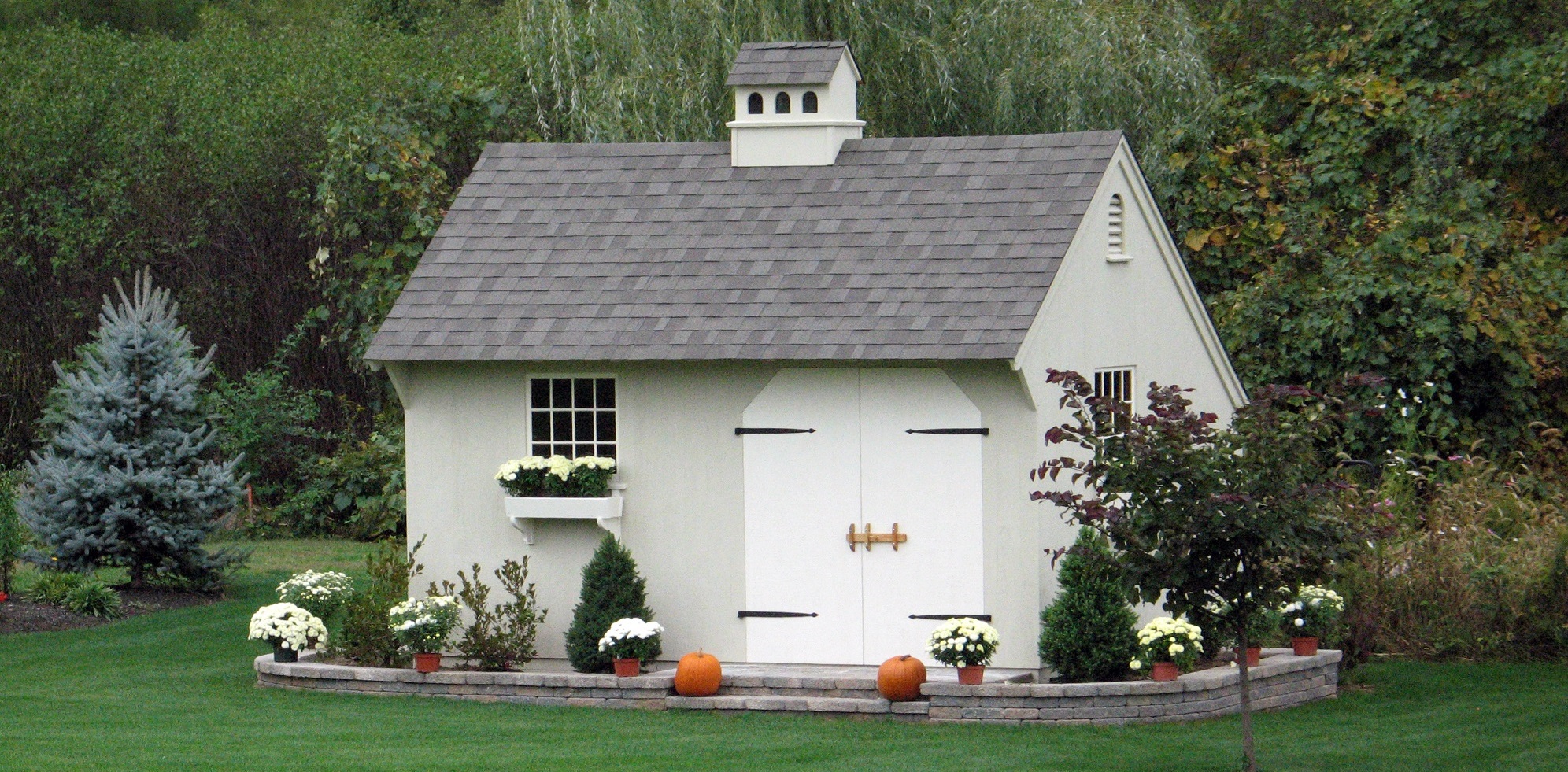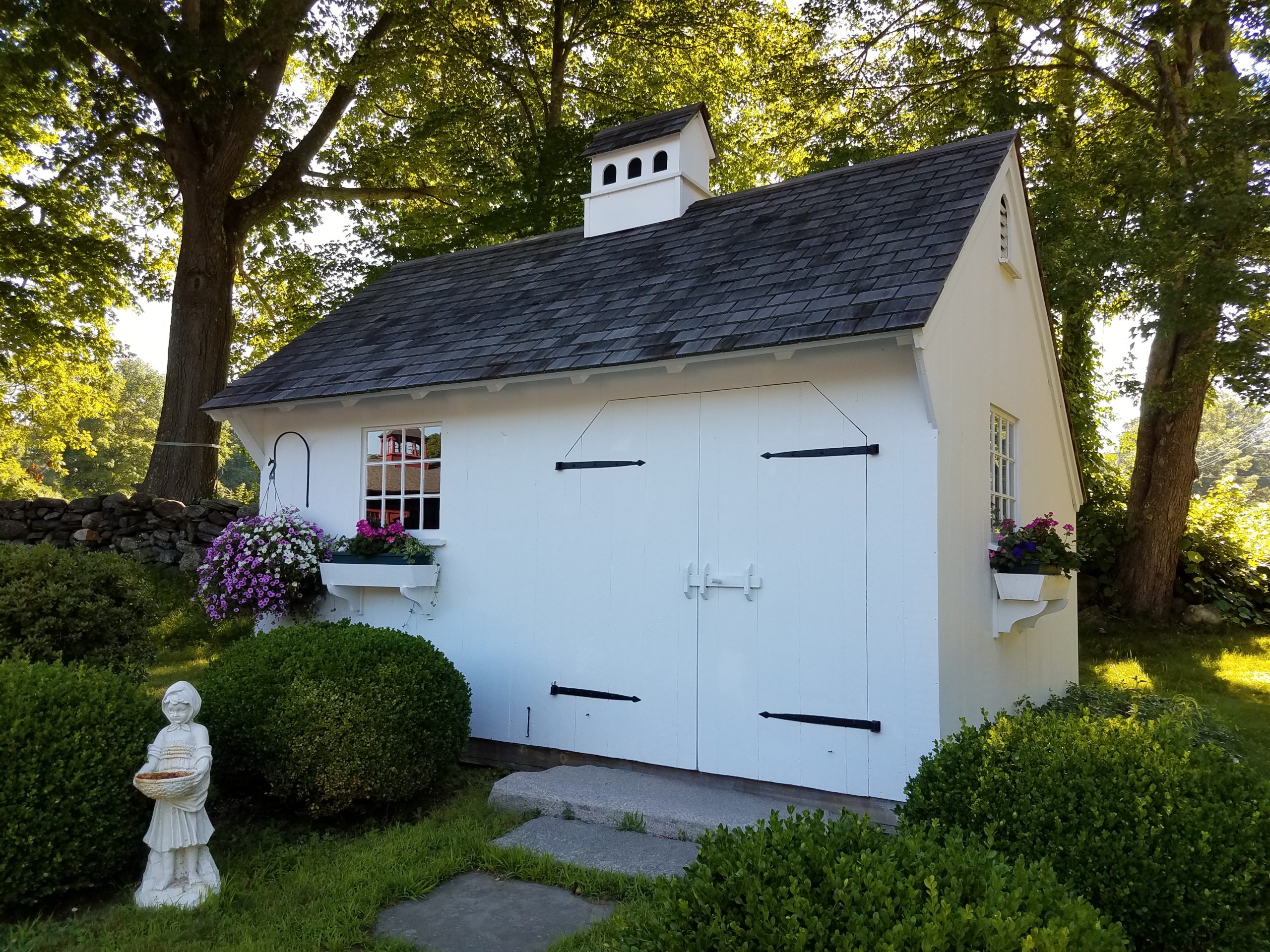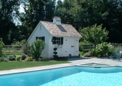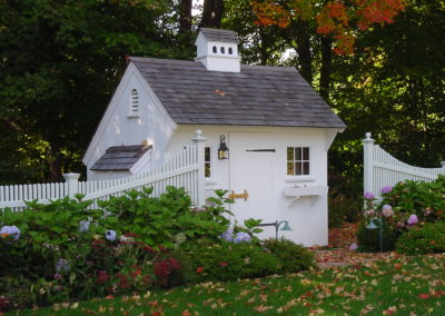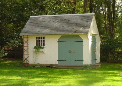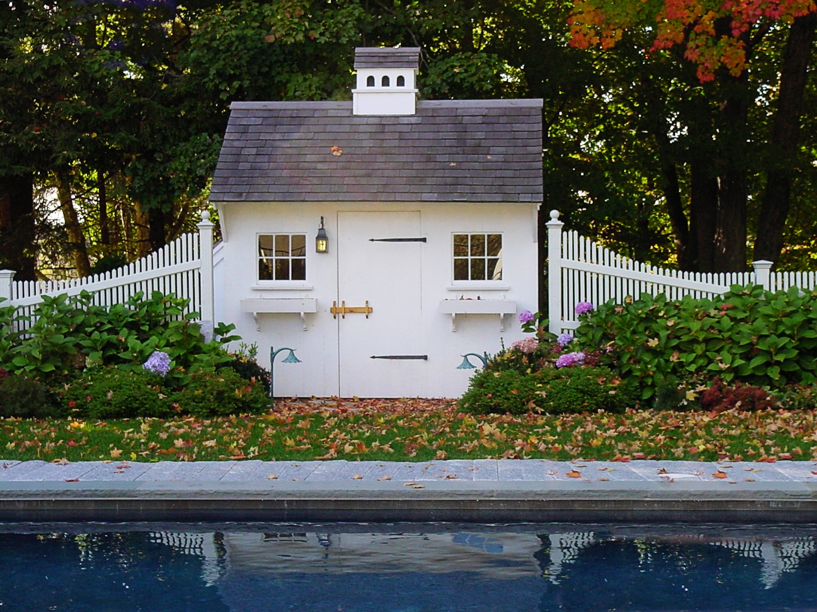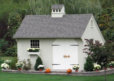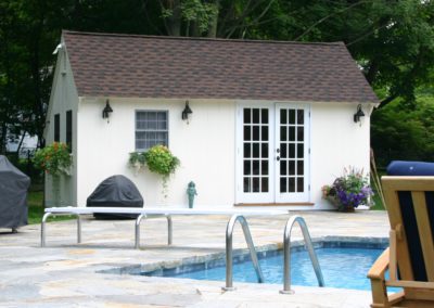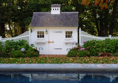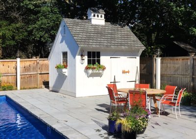 9′ x 11′ Pool Shed with included 5′ swing-out door, 6 lite-windows with flower boxes and optional dovecote cupola.