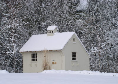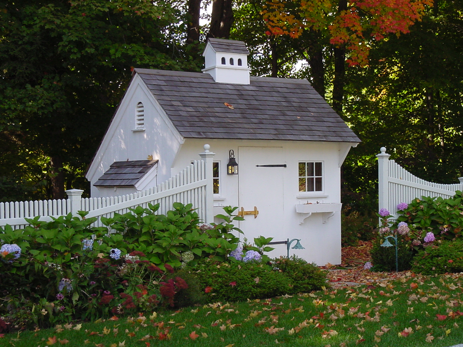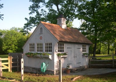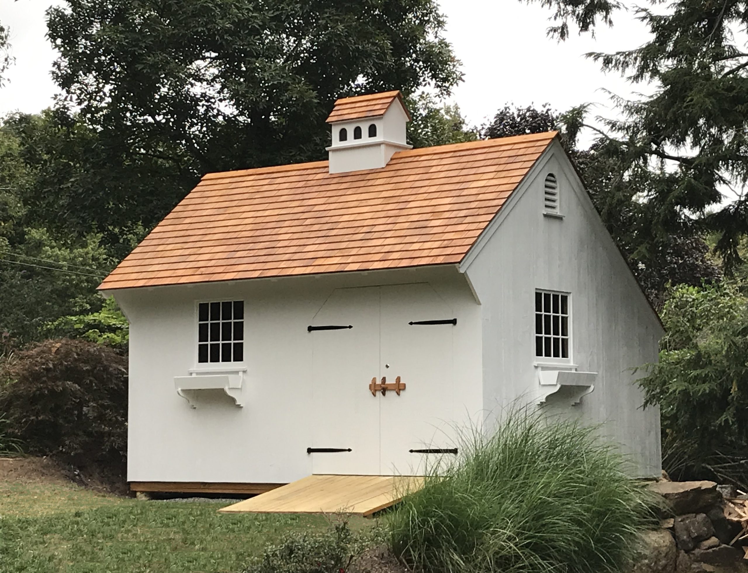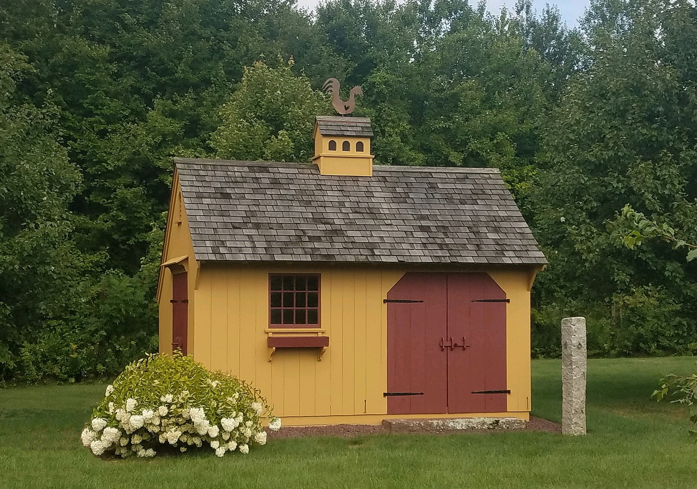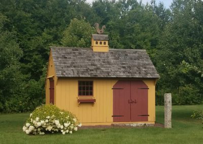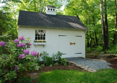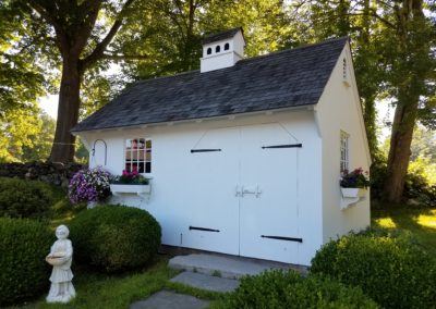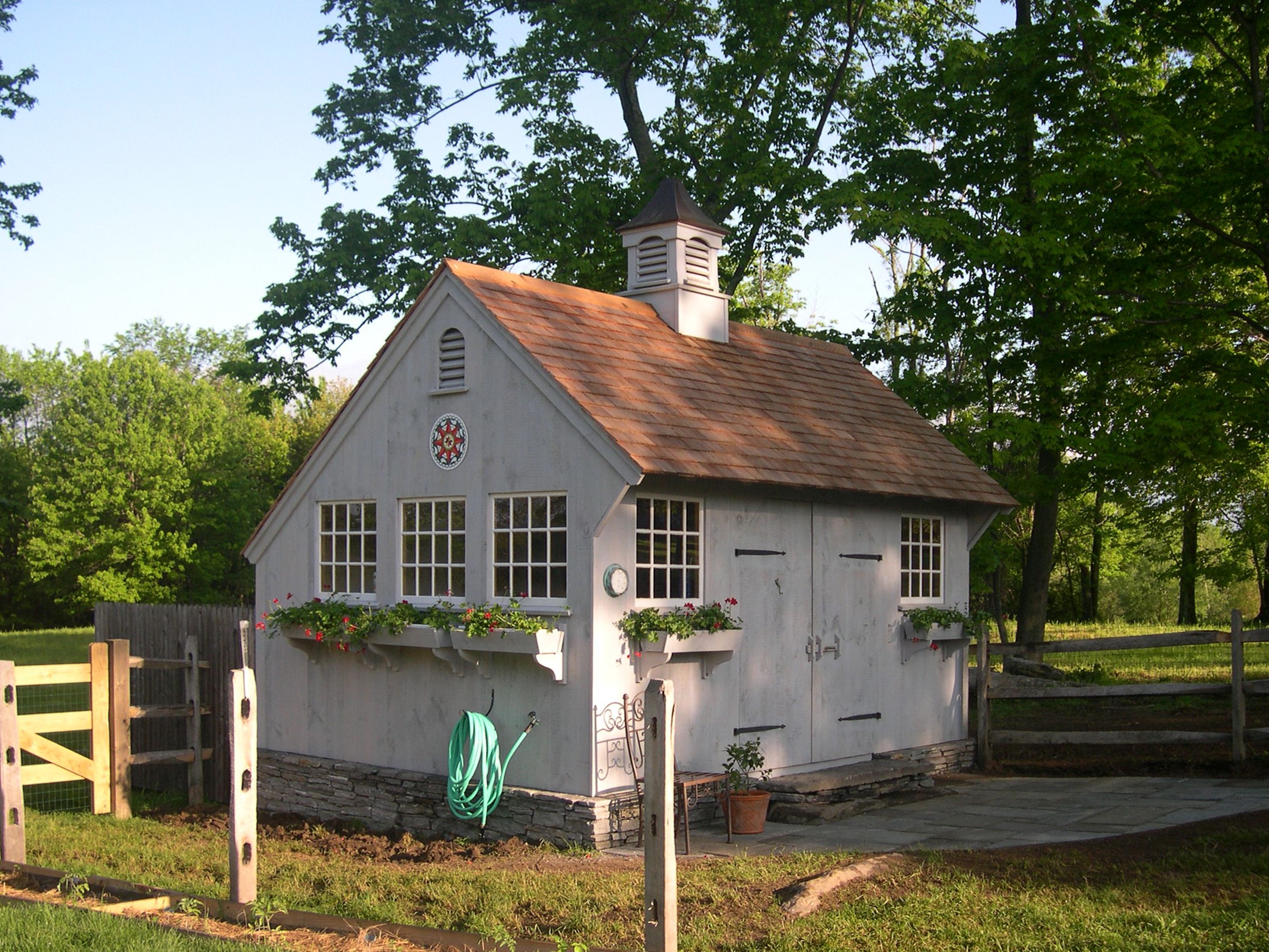 9′ x 11′ Pool Shed with included 5′ swing-out door, 6 lite-windows with flower boxes and optional dovecote cupola.